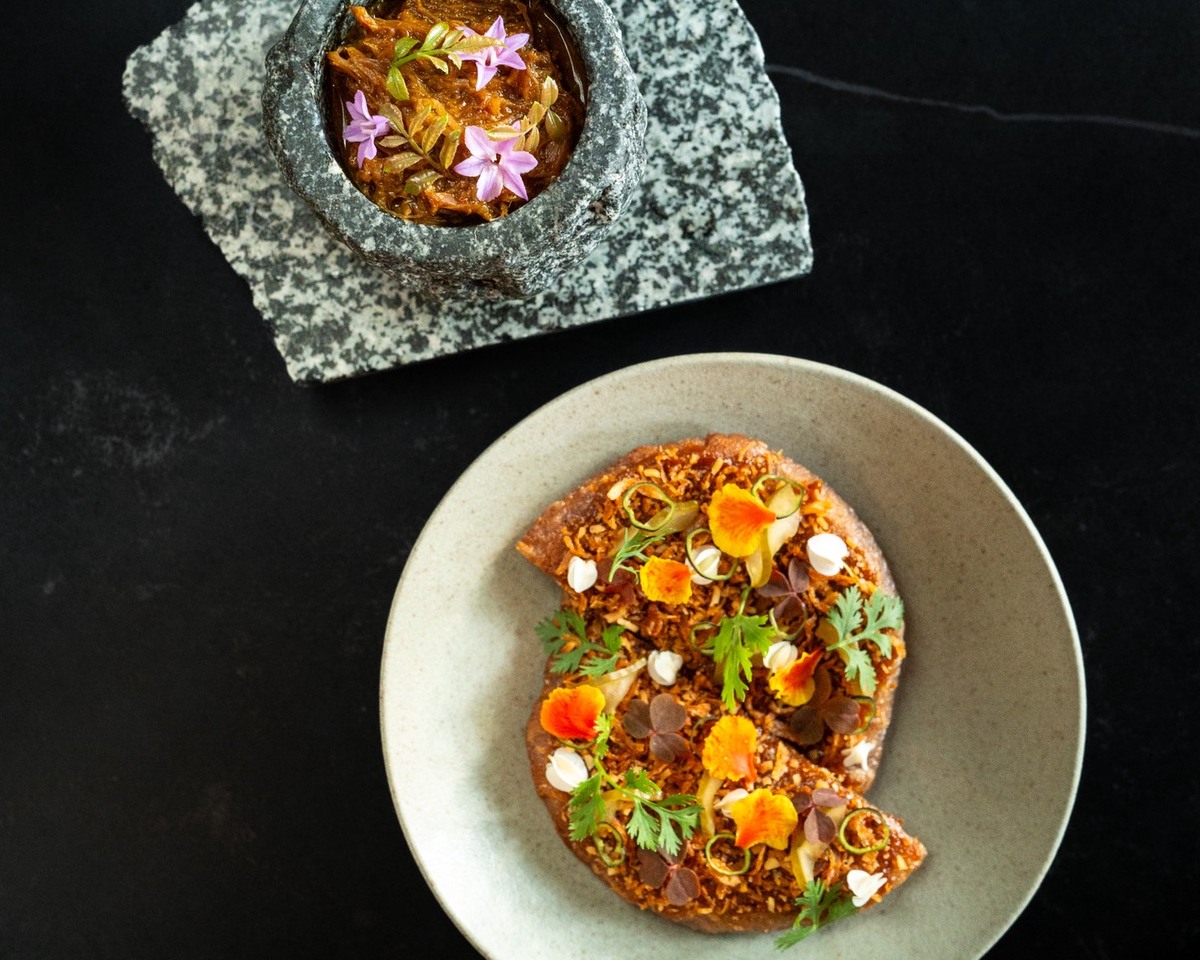 12-hour braised duck leg in red roasted curry, served with a 44-layer roti — a Southern rice bread made from Med Fai rice.
