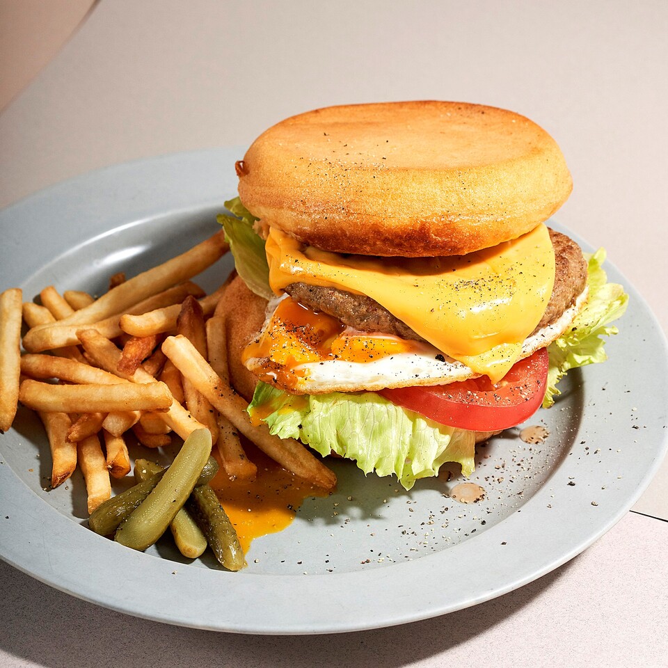 The voluminous hamburger, with its chewy hand-kneaded patty, melty cheddar cheese, fried egg, and tomato, is a highly satisfying dish.