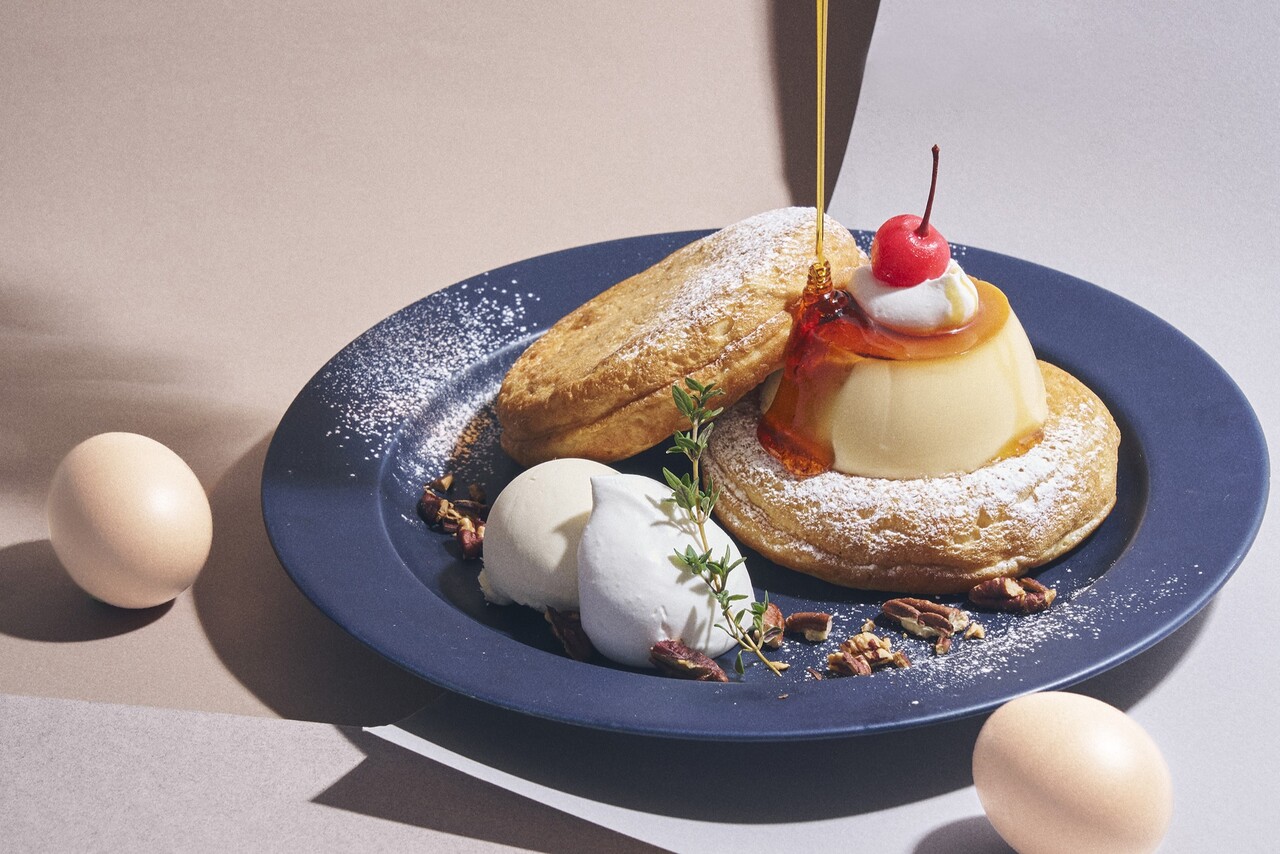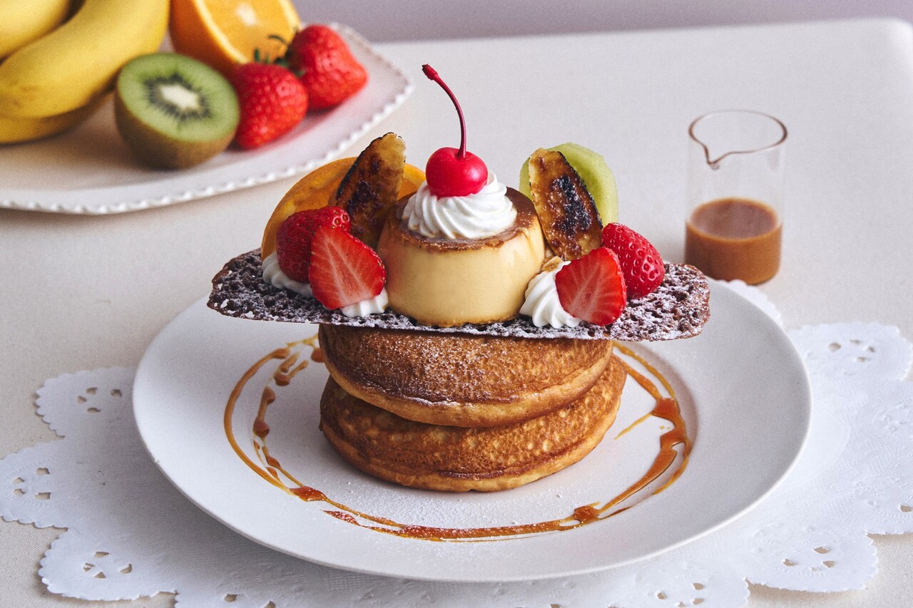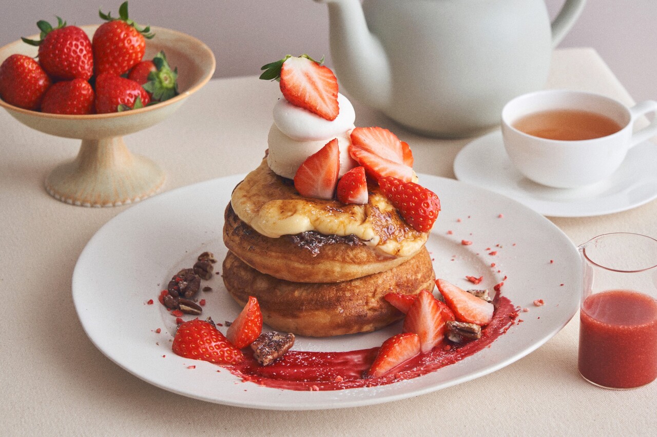 Enjoy a whole pancake that tastes just like strawberry shortcake all to yourself. The airy cheese cream melts softly like snow and blends with the tartness of strawberries for a sweet and sour experience. The fragrant almond tuile adds a pleasant accent to every bite.