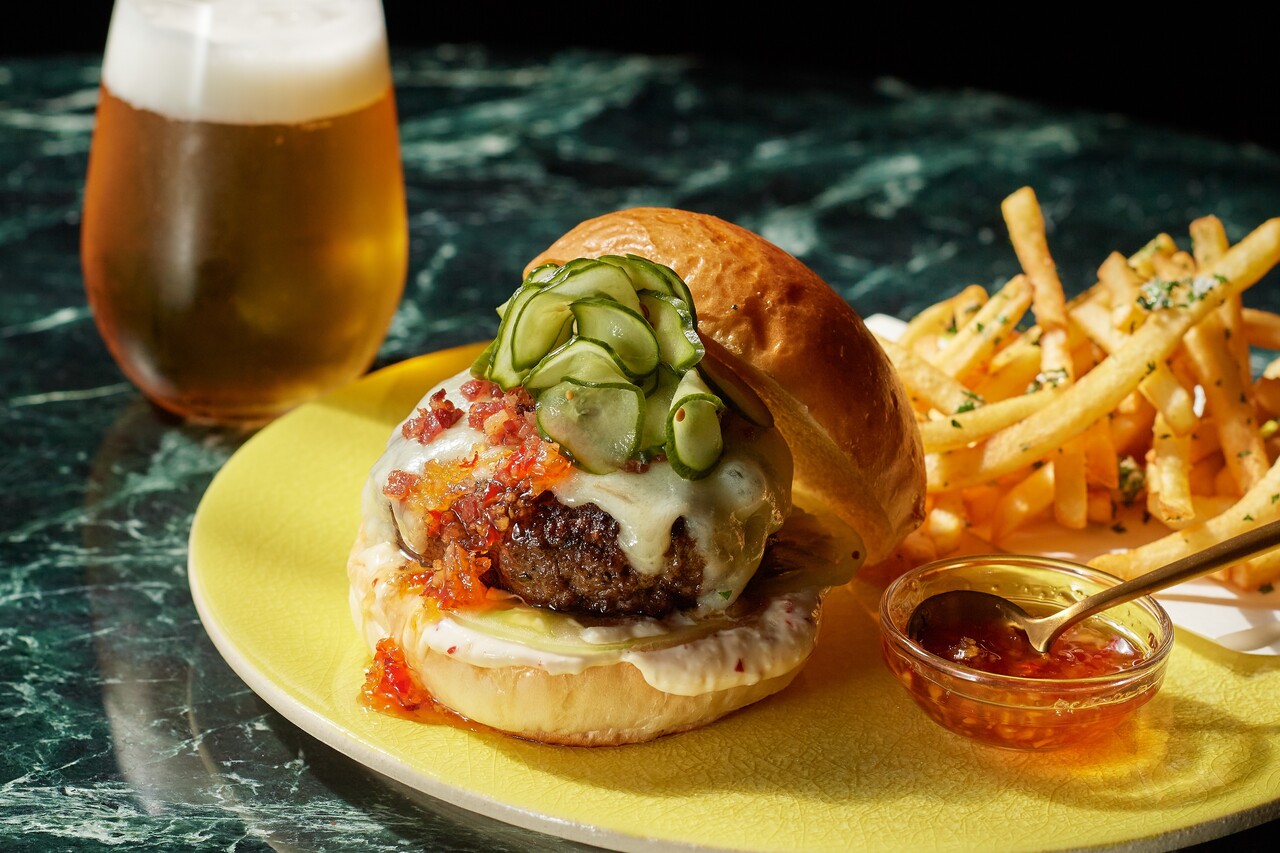 【TAKEAWAY】wagyu burger, grilled swiss, pickled green chilli herb mayo, tomato relish and fries