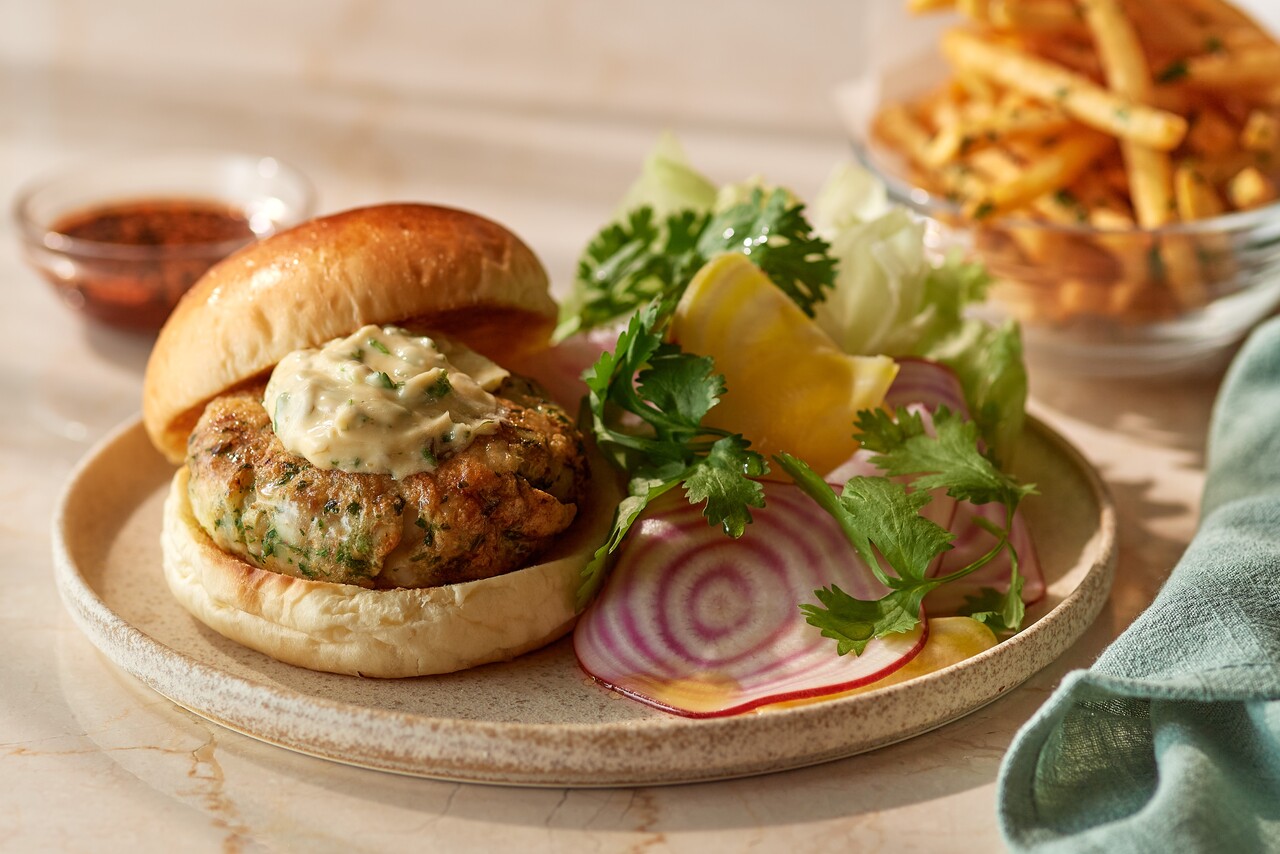 shrimp burger, jalapeño mayo, shaved radish and fries