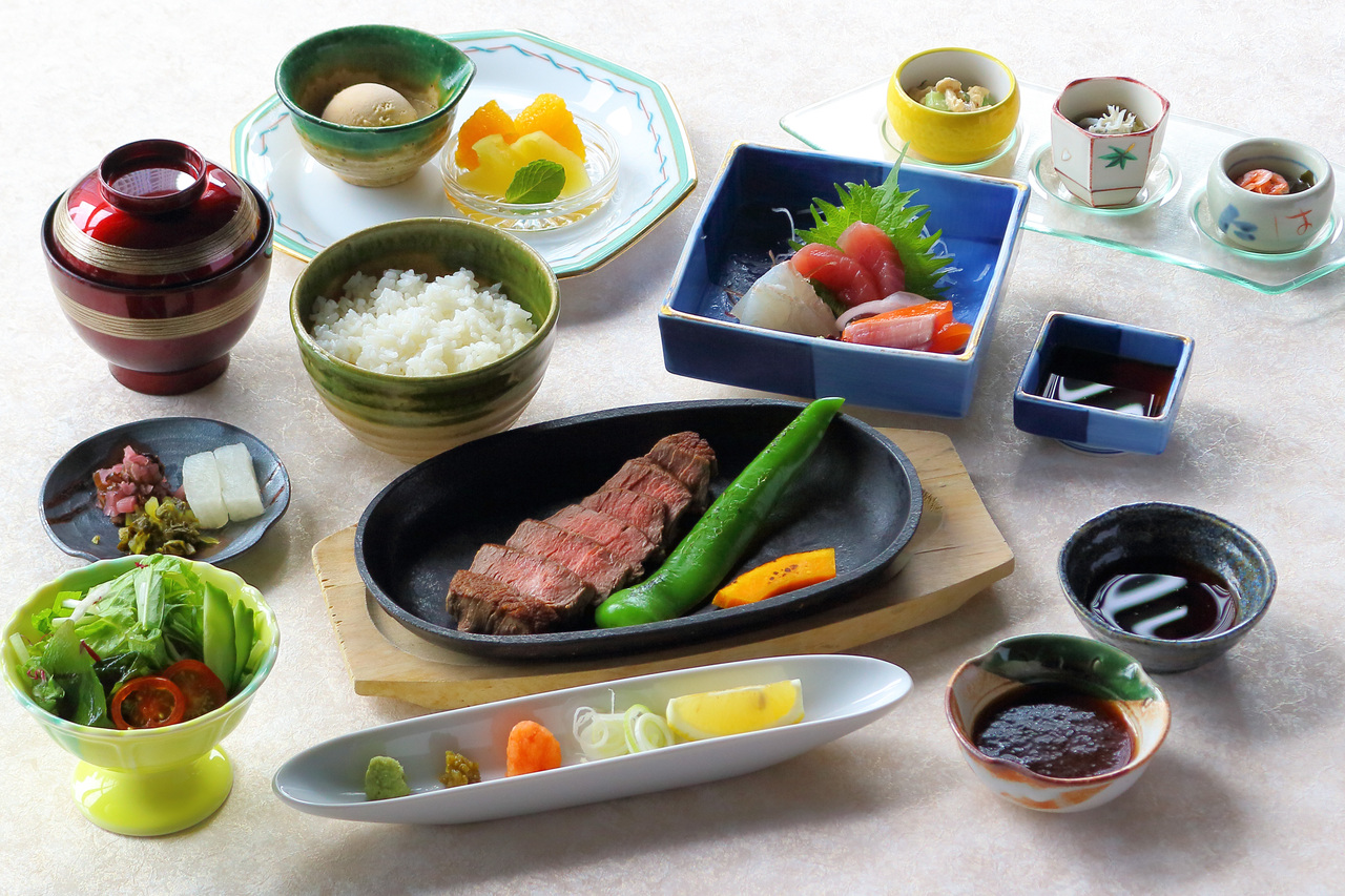 小鉢・造り・国産牛フィレステーキ・食事・デザート