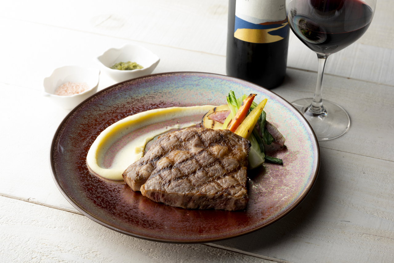 信州味噌に漬けた信州アルプス牛のグリル 冬野菜のガトー仕立て