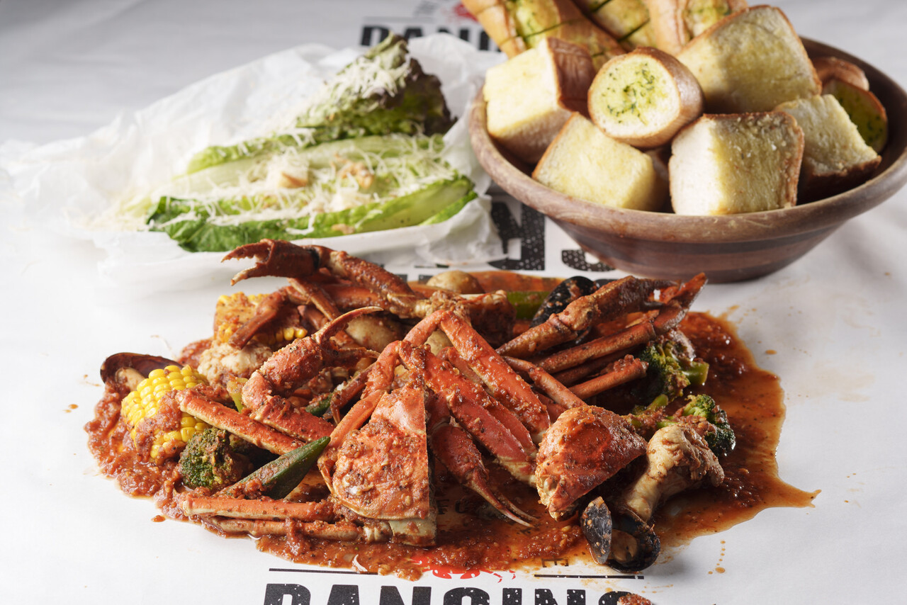 A great value lunch course featuring a large portion crab combo bag with seafood you can grab with your hands, plus a salad!
