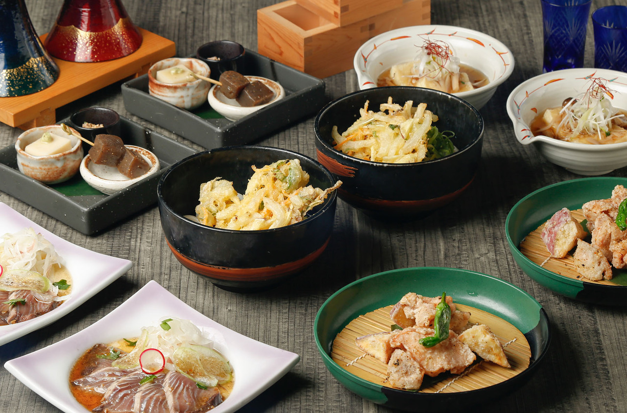 Menu: [Appetizer] Assorted 3 types of appetizers [Sashimi] Assorted 3 types of sashimi [Sushi] Wagyu beef nigiri sushi with 2 types of wasabi [Vegetables] Kyoto mizuna and edamame salad [Steak] Wagyu beef steak with yuzu miso butter sauce [Meal] Chopped fox udon for the final course *Additional tempura platter (1,500 yen tax included) is also available. Please order on the day.