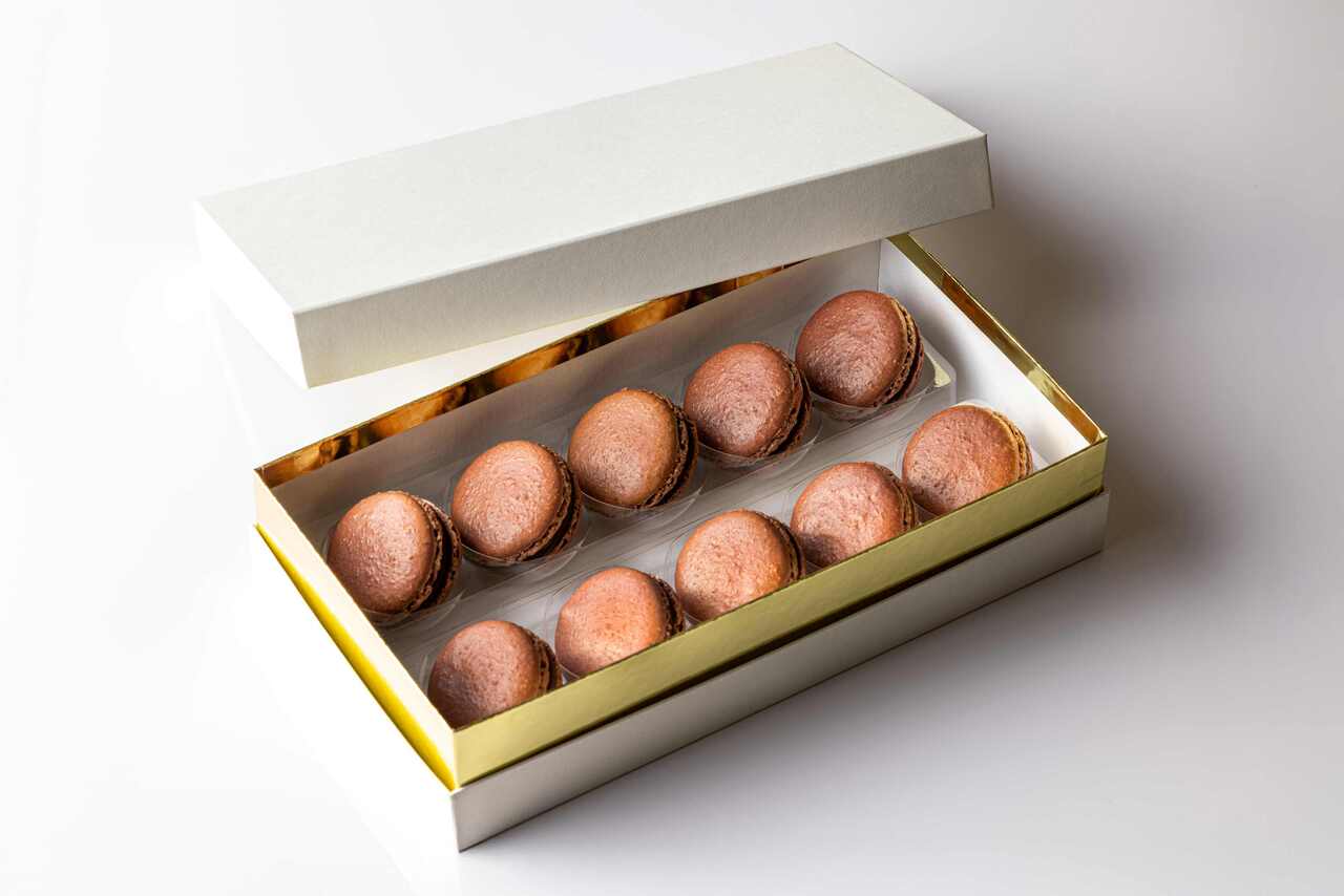 バレンシア産のアーモンドを荒びきにしたオリジナルのプードルを使用し、こだわりのフレンチメレンゲでマカロンを焼き上げました。ガナッシュにはチュアオショコラのビターとミルクをブレンドしたほのかな酸味と野性味のあるカカオ感が感じられる唯一無二の味わいのショコラマカロンに仕立てました。