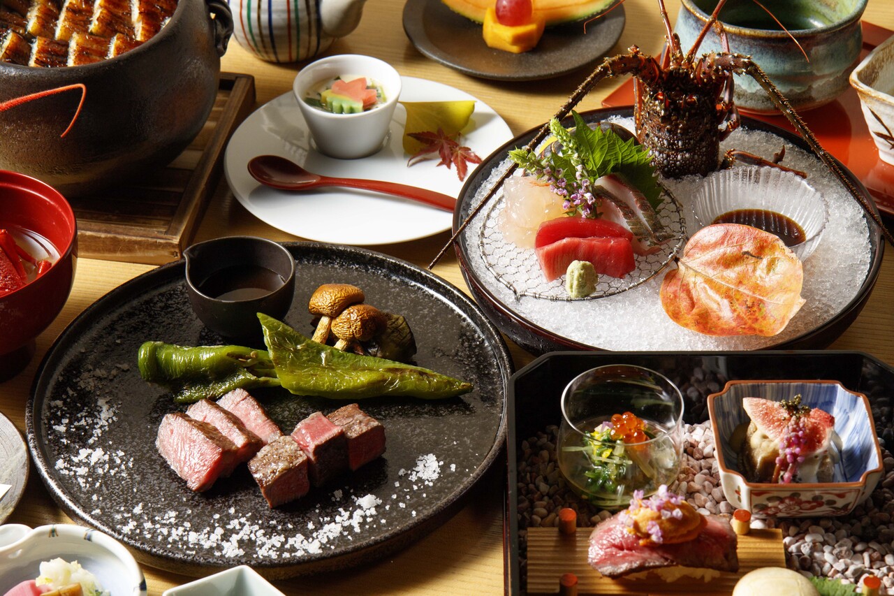 Our restaurant offers a luxurious plan featuring our original snow-aged wagyu beef, Ise lobster sashimi, and seasonal dishes. For the final dish, you can choose from our signature clay pot rice with premium rice and sea bream, or our special domestic eel hitsumabushi, in addition to the main dishes.