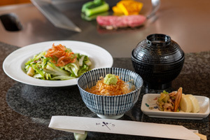 前菜/サラダ/富嶽白鶏 粒マスタードソース添え/黒毛和牛ロース(120g)¥14,500⇒¥13,500、黒毛和牛フィレ(100g)¥16,500⇒¥15,500/季節の焼野菜/和牛ローストビーフ丼/留椀・香の物/デザート/コーヒー または 紅茶★平日選べる1ドリンク付き