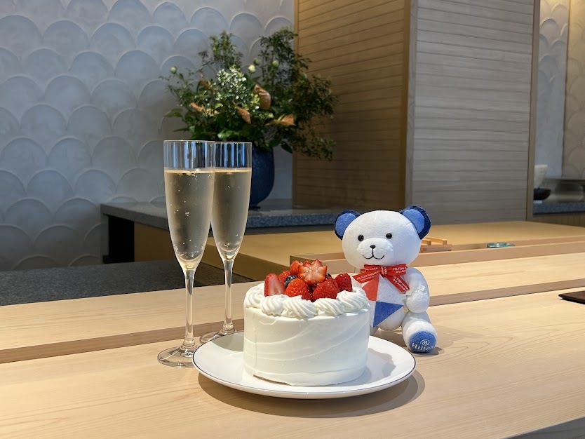 [Plan Contents] *For 2 people, 1 Hilton Nagasaki original bear, 12cm whole cake, glass of champagne for toasting (non-alcoholic also available)