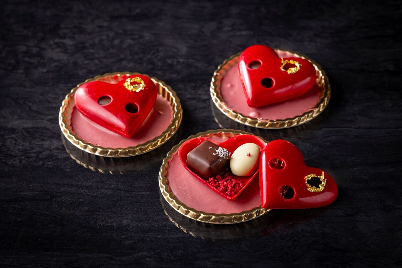 The heart is made with 35% Felchlin Opus White chocolate and the base is Barry Callebaut ruby chocolate, creating a flavor that combines a mellow richness with the fruity acidity unique to ruby, softly spreading throughout the mouth. The bonbons peeking out from the gaps in the heart and the sparkle of gold powder add a touch of elegance befitting a special gift.