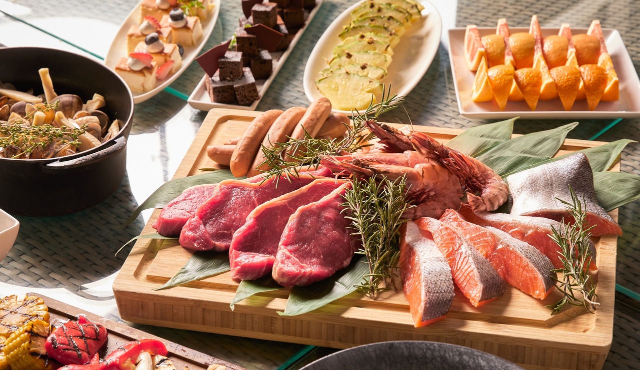 牛ロースや豚スペアリブ、ボイル帆立などBBQプレートは席までお届け。その他のメニューはビュッフェスタイルで。サラダや焼き野菜から、アヒージョやカレー、デザート、ソフトドリンクまで、お好きなものをお好きなだけお楽しみください。