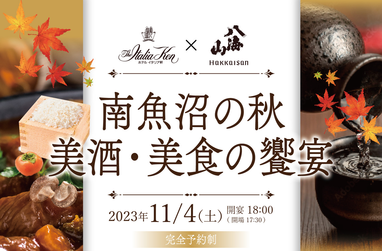 “秋の南魚沼”を「西洋料理」と「八海醸造」のお酒で堪能できる特別賞味会。ホテルイタリア軒 総料理長 関本が厳選した南魚沼の食材を使用したスペシャルディナーと、今年創業101年の八海醸造の銘酒のマリアージュをお愉しみください