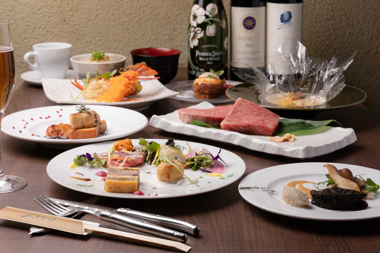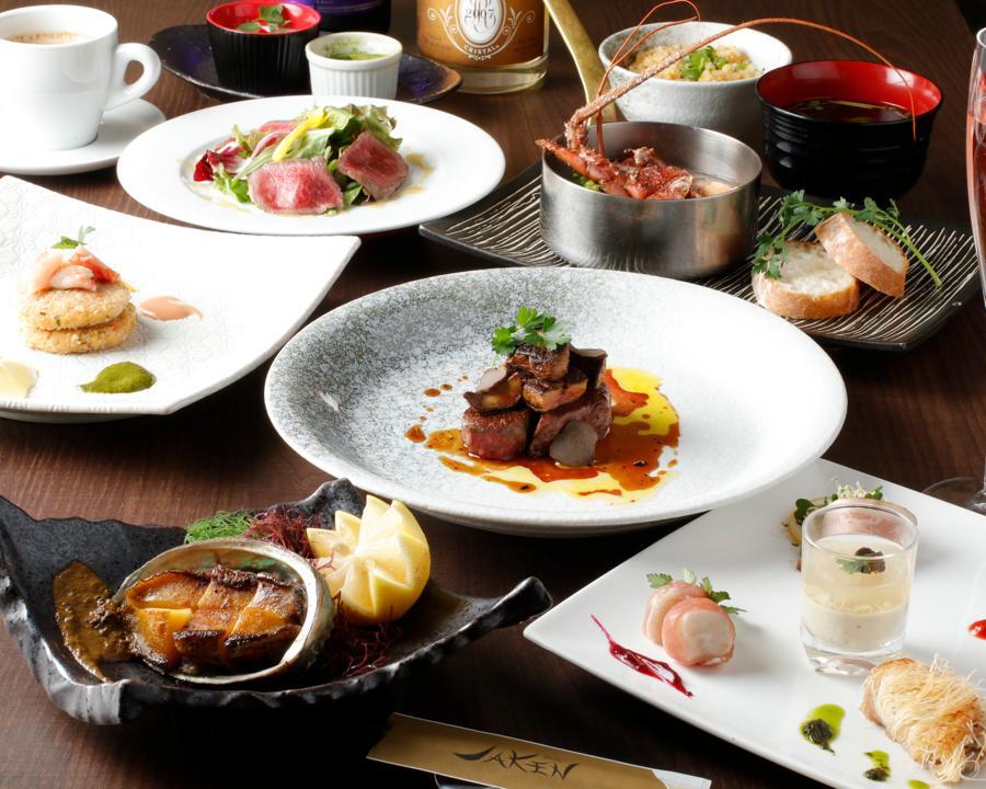 【MENU】 Christmas hors d'oeuvre ~ red and green dichroic sauce ~ ~ marinated champagne julé of Hiroshima oyster and caviar, served with foie gras terrine and root celery mousse snow crab and salmon tartar tomato falci, holo holo chicken putty campagne ~ Special sweet salad of Japanese wagy Tataki Assorted vegetables with soft shell shrimp and gratin of red sea bream French foie gras and raw ham Kaedai winding ~ Hiroshima lemon-flavored balsamico sauce ~ Special black rose wagyu beef loam & peach steak ~ red wine sauce ~ JAKEN original garlic rice (With red juice) Christmas dessert ~ Roll cake of strawberries and green tea, Gelato of coffee