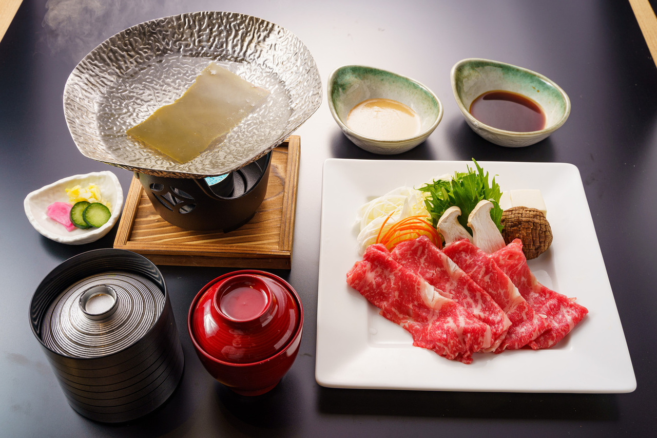 One dish / Yamagata beef sukiyaki small pot with sauce / Full meal / Today's dessert and after-meal drink