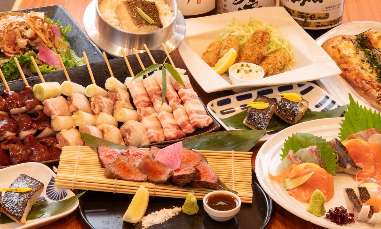 焼鳥、宮崎牛、刺身5種の入ったちょいリッチコース