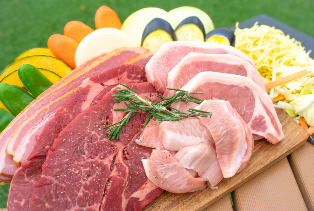 大人:豚ロースステーキ100g、鶏ももステーキ120g、厚切りベーコン80g、フランクフルト80g、季節の野菜3~4種、焼きそば75g(肉・野菜付)