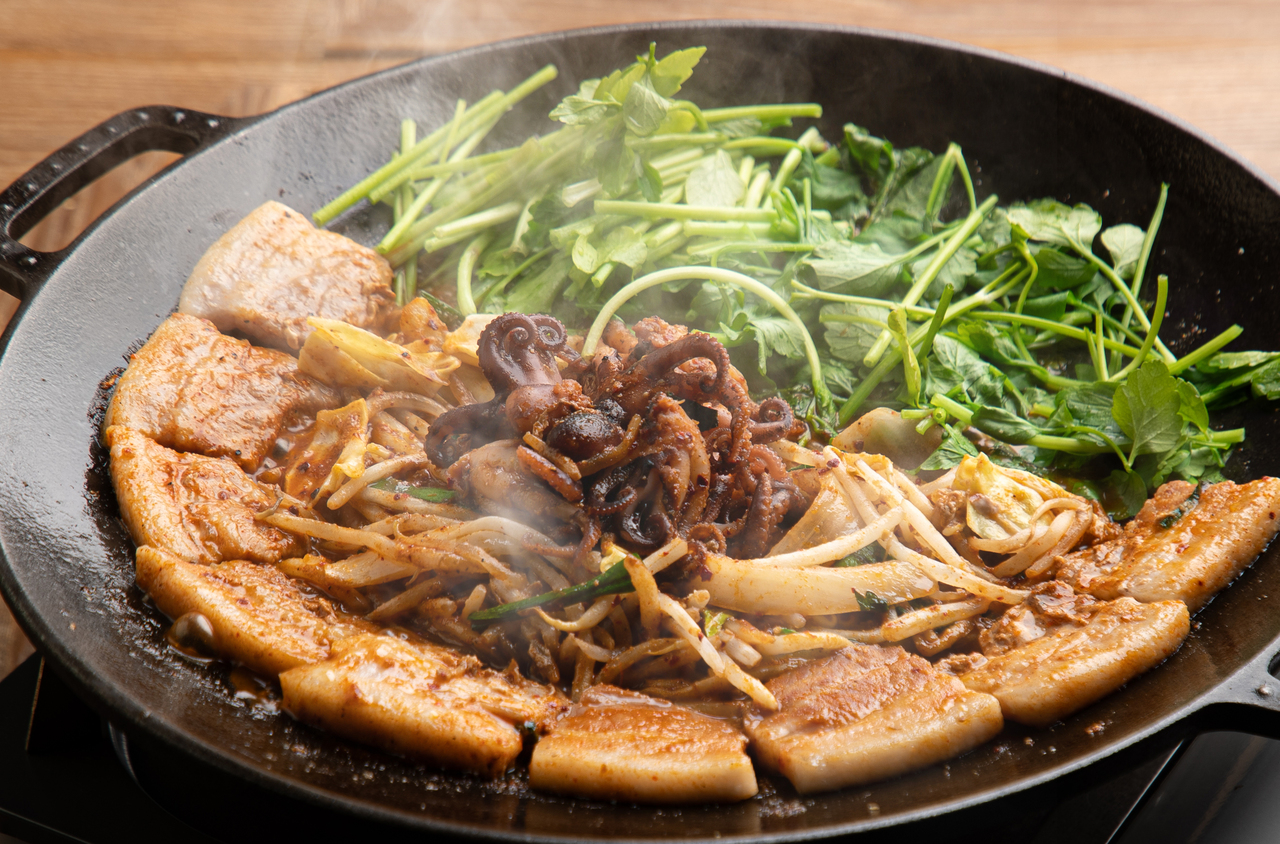 新鮮野菜のチョレギサラダや、定番のキムチとナムル盛り合わせから始まり、選べる鍋(メイン)はイイダコを使った「チュクミサムギョプサル」、またはジューシーな「厚切りサムギョプサル」、新登場した「コリアン旨辛もつ鍋」、「海鮮キムチチゲ」の4種類をご用意。さらに人気のヤンニョム&ハニーマスタードチキン、蒸したて熱々のせいろ蒸しマンドゥ、〆のお食事、最後はアイスまで大満足の全8品。