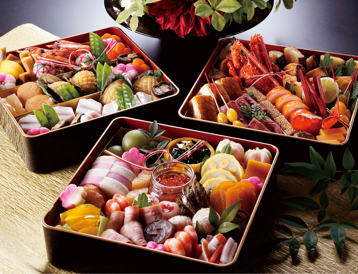 Smoked salmon hosho-maki (rolled in paper), grated yam with maple leaf shape, ginkgo nuts
