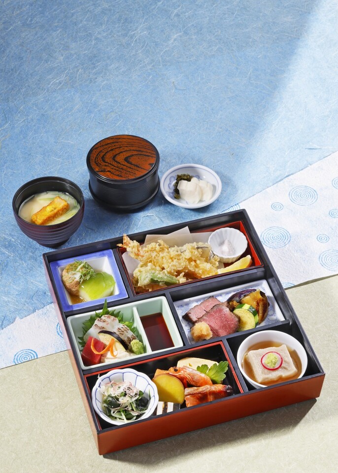 お造り・ローストビーフ・焼魚・コロッケ・出汁巻卵・季節の焚き合せ・おにぎり等を彩り良く詰め込みました。