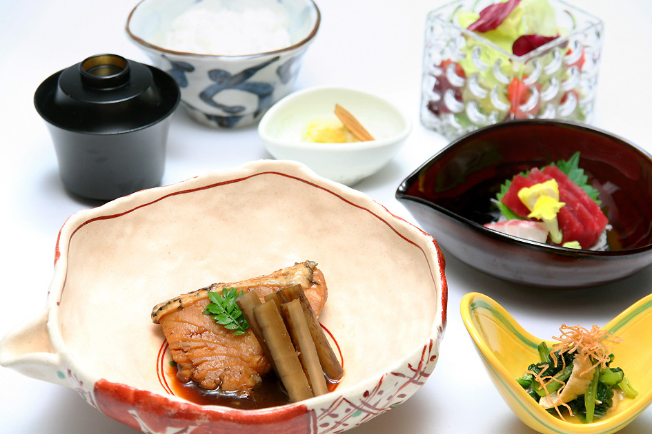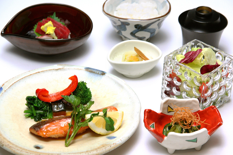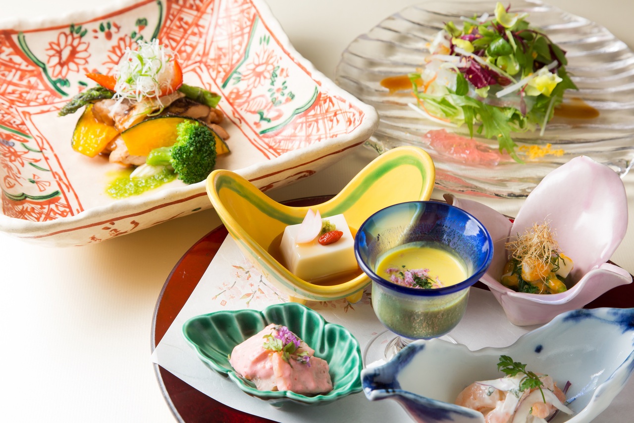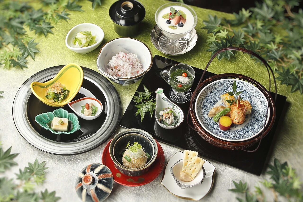 Sample menu: Seasonal vegetables, sashimi, hot dishes, side dish, grilled items, rice, dessert.