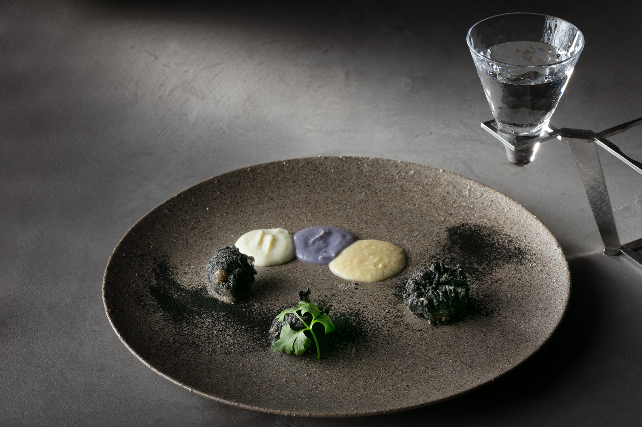 ・竹炭を纏った鮟鱇フリット 3種のカリフラワーと共に