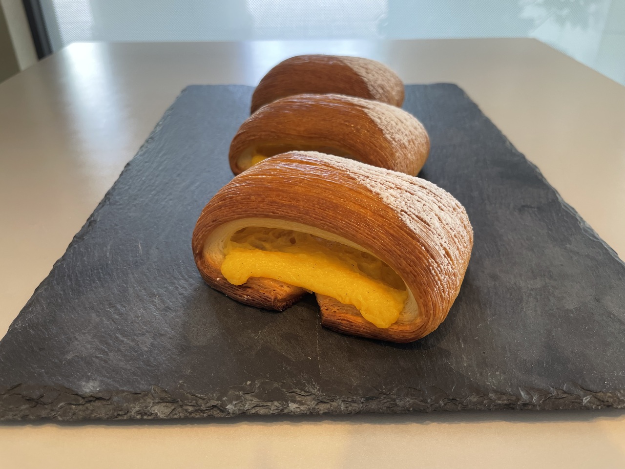 クロワッサン生地を使用しているので、パリパリとした食感とカスタードクリームなどの柔らかく甘い食感がとても合うパンです