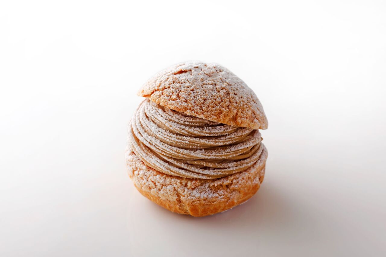 外はサクッと中はしっとりしたクッキーシュー生地に黒蜜あんこ、抹茶カスタードクリーム、パッションジュレ、渋皮栗に濃厚なマロンカスタードクリームをのせ、仕上げにモンブランクリームを絞った秋限定のシュークリームです。