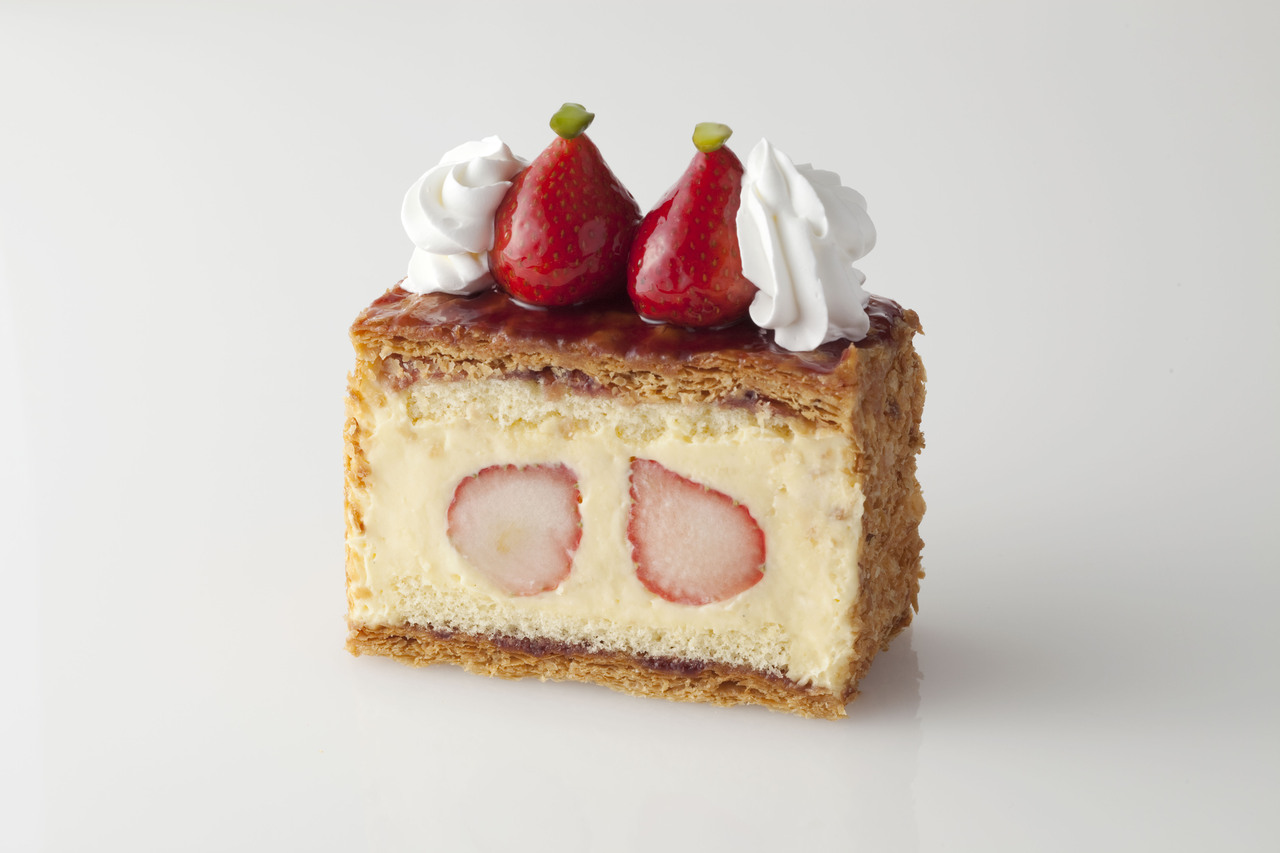 「博多あまおう®」との相性抜群なホテルニューオータニ特製カスタードがたっぷりと。さらに、パイ生地とクリームの間のスポンジ生地には長崎県産「太陽卵」を使用。「博多あまおう®」の弾けるようなみずみずしい甘みとサクサクのパイ生地、さらにふっくらとしたスポンジ生地のコンビネーションをご堪能できる逸品です。
