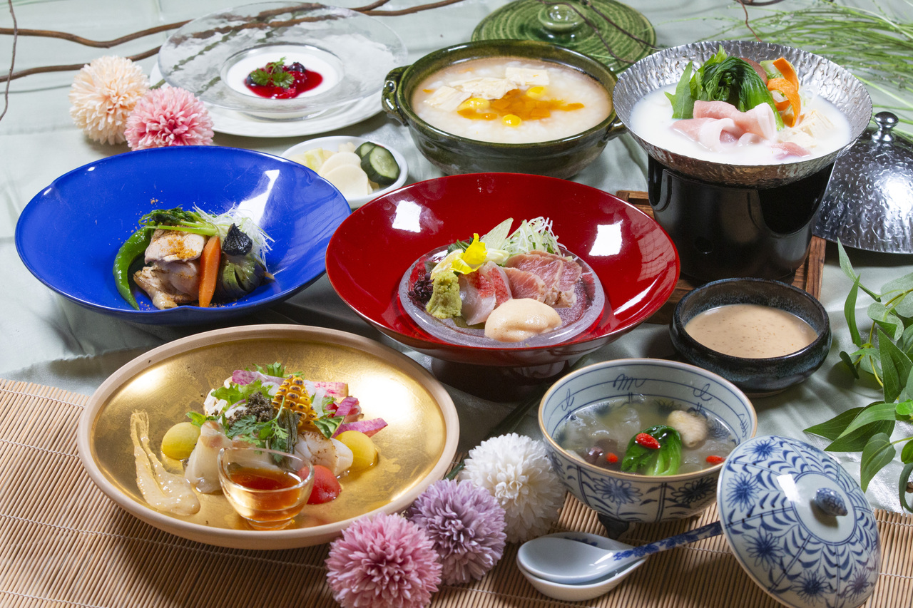 ・Himiko steamed sea bream and scallops with the aroma of koji and dressing made with Ishino miso ・Mishima vegetables and a gift from Suruga Bay, seared red fish and vegetables from the foot of Mt. Fuji ・Medicinal soup made with local chicken and white jellyfish, dedicated to Yang Guifei ・Brand pork soy milk collagen hot pot with special sesame ponzu sauce and green and yellow vegetables ・Roasted local chicken with the aroma of Japanese pepper and perilla ・Condiments made with Mishima green onions and foot of Mt. vegetables ・Medicinal porridge with pumpkin and soft-shelled turtle soup ・Due to availability of sweets, some of the contents may be changed.