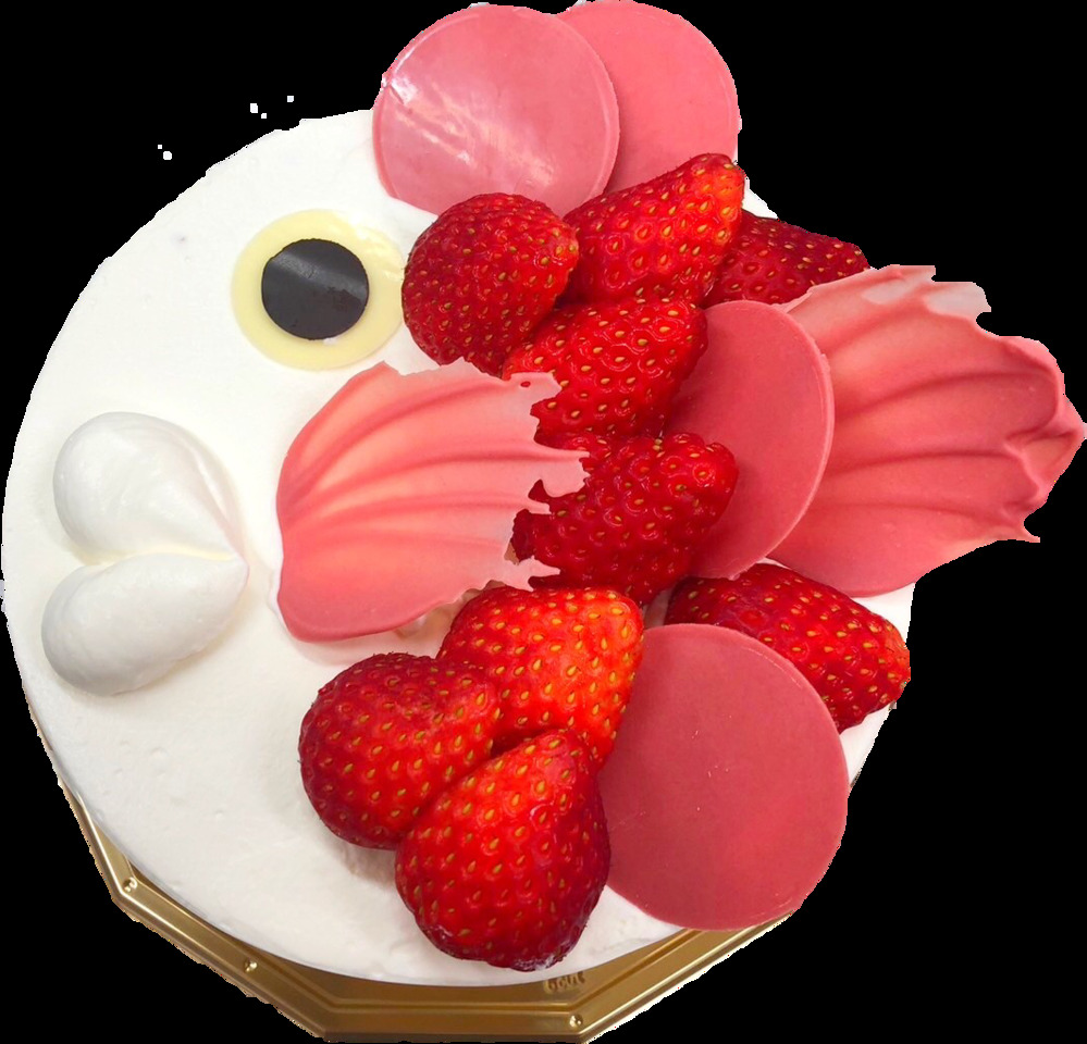 A classic shortcake whole cake. Three sponge cakes and strawberries sandwiched between the second layer of whipped cream! The fins are made of strawberry chocolate. A free plate with your child's name on it is included.