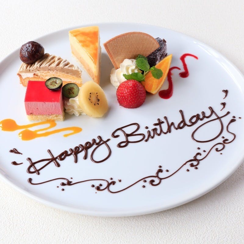 特別なメッセージをお皿にお書きしてご用意。ガトーショコラを中心にしたデザートプレートです。
