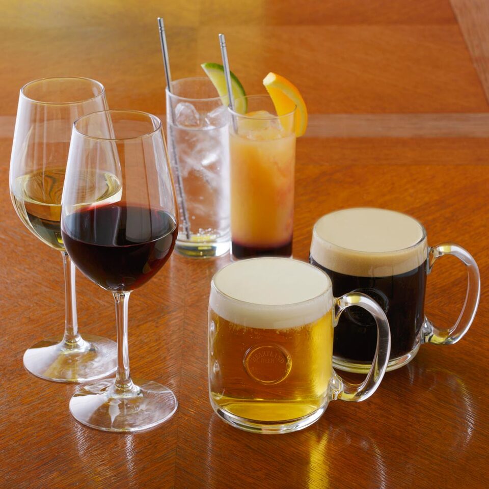ポメリー ブリュット・ロワイヤル、一番搾り生ビール、ワイン(赤・白 各3種)、ハイボール、焼酎(麦・芋)、梅酒、カクテル3種(ジントニック・カシスオレンジ・ファジーネーブル)、ノンアルコールサワー6種 ※アルコール入りに変更可能(檸檬サワー・日向夏サワー・巨峰サワー・白桃おろしサワー・パッションフルーツサワー・キウイサワー)
