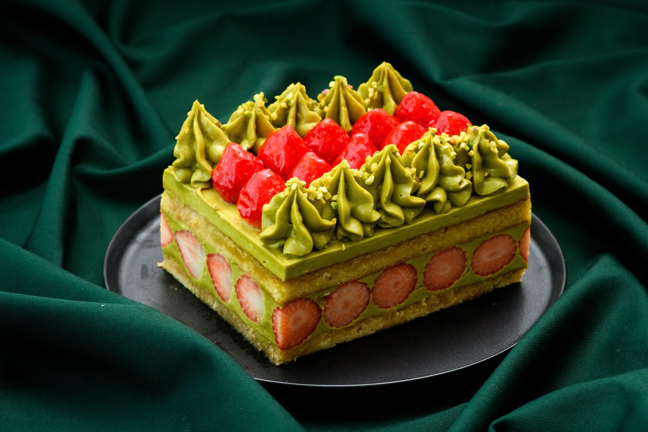 A gorgeous Christmas Eve cake made with vibrant strawberries and mellow pistachios. The rich flavor of fragrant pistachios, the sweet and tart taste of strawberries, and the moist biscuit all combine to add color to a special moment.