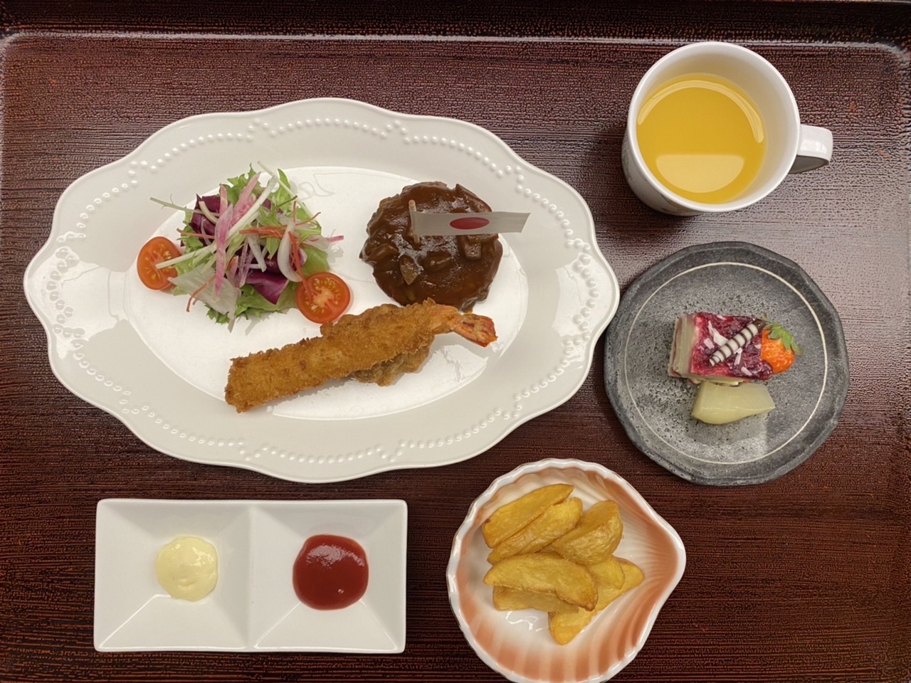 Main items: Ebi fry (deep‑fried shrimp), Karaage (Japanese fried chicken), Hamburger steak, Potato