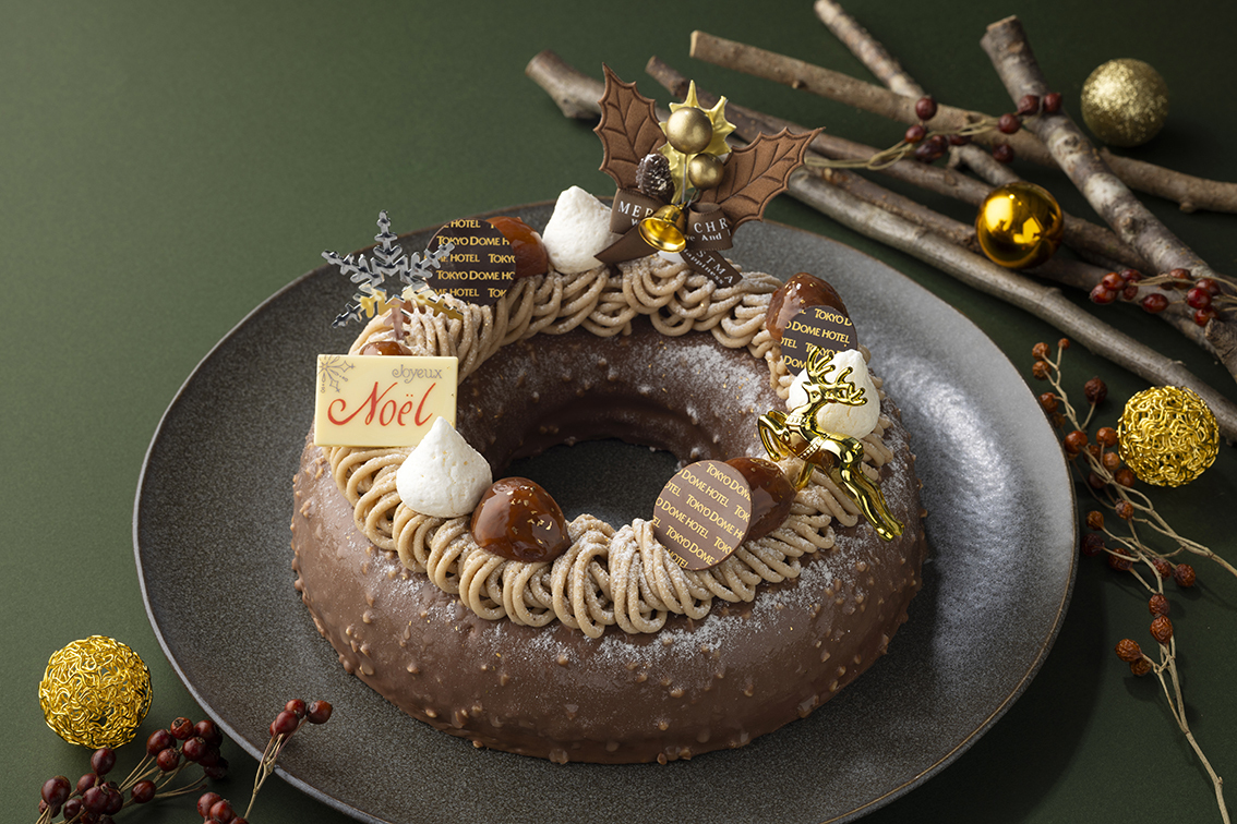 クリスマスのリースに見立てたモンブラン。土台はアーモンド香るダックワーズ生地。マロンムースと生クリーム、カシスソースをミルクチョコレートでコーティング。和栗とフランス産マロンクリームを使用したクリームをたっぷり絞りました。