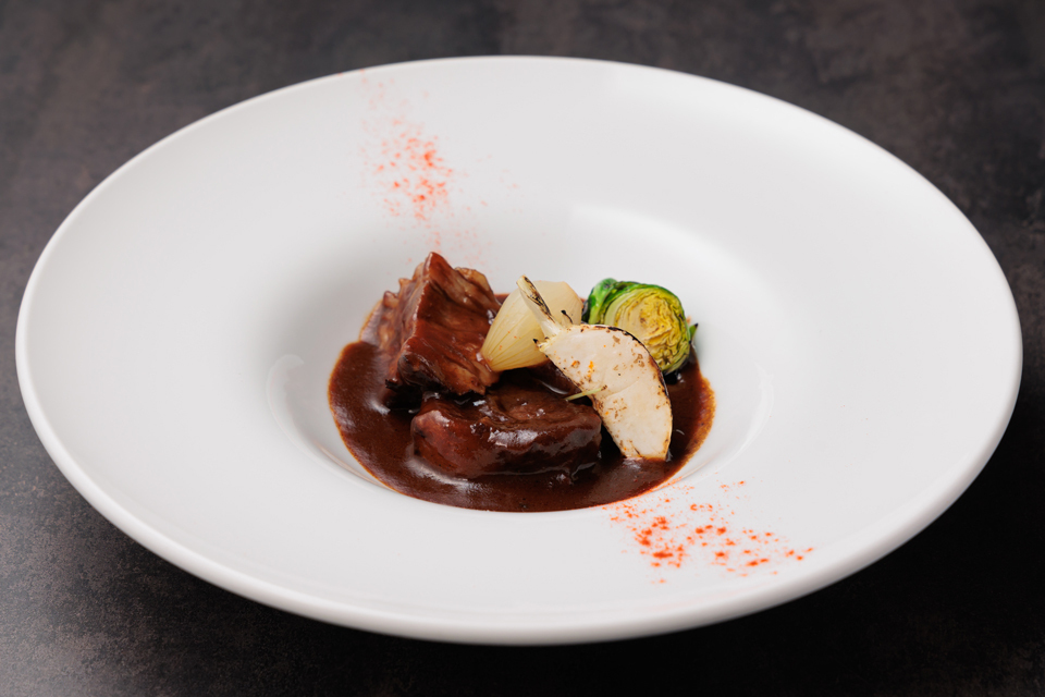 国産の牛バラ肉をたっぷりの赤ワインと香味野菜で煮込みました。