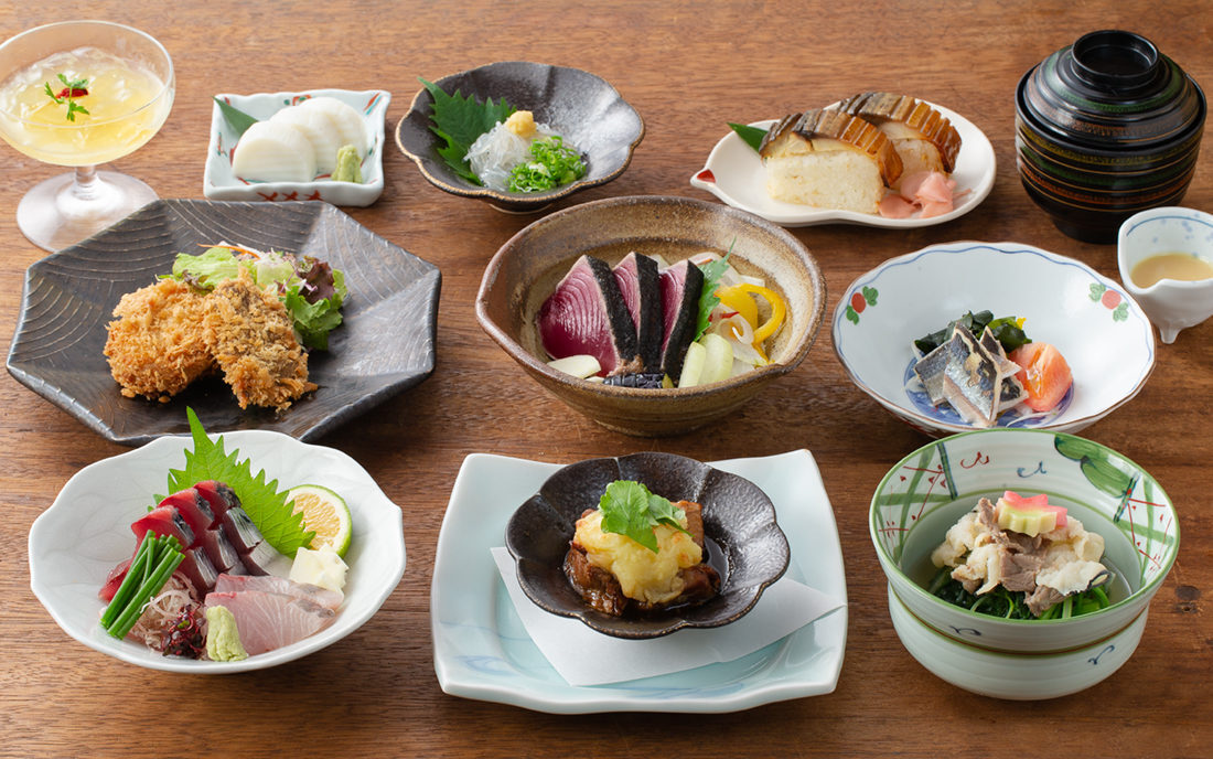 鰹のたたき、ウツボのたたき、鰹コロッケ、鯨のカツ、鯨の大和煮、どろめ、御飯、漬物、赤だし