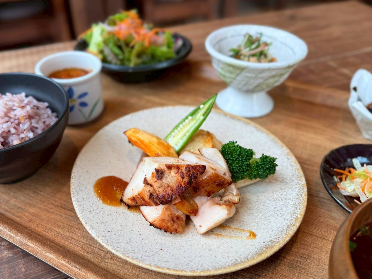 桜姫鶏胸肉を玉ねぎの塩麹で漬け込んで柔らかく上品な仕上がりで焼き上げてあります。