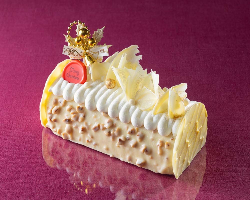 羽のような飾り付けが華やかな、ヘーゼルナッツとバニラのケーキ。オレンジコンフィの酸味とカラメルムースの香ばしさが、バニラの甘さと調和して華やかな味わい。