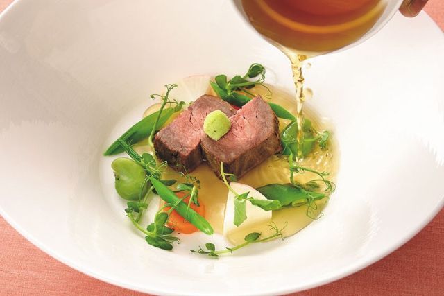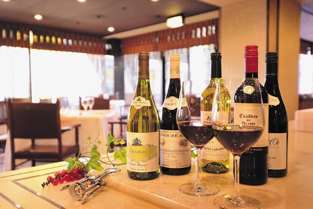 ① Shrimp stuffed in gougères and avocado salad ② Charcoal-grilled tuna tartare with radish and cercle tapenade sauce ③ Camembert cheese and potato gratin with croutons ④ Herb sausage and cabbage rolls in winter vegetable pot-au-feu with whole-grain mustard ⑤ Coho salmon and spinach steamed in a yuzu-flavored wine blanc sauce ⑥ Grilled beef sirloin with seasonal vegetables and a Japanese-style sauce with lefort cream and red wine ⑦ Hotel 50th Anniversary: A revival of the hotel's traditional Japanese-style spaghetti ⑧ Earl Grey crème brûlée with sour cream and pear sorbet ⑨ Coffee or tea