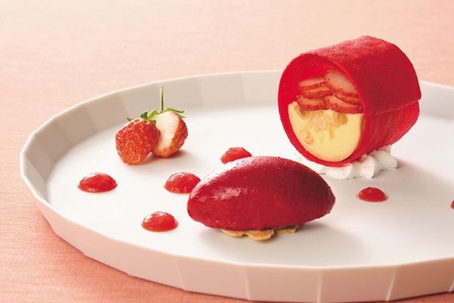 ① Marinated tuna, daikon radish cooked with chicken stock, and fresh daikon radish salad with yuzu dressing ② Camembert cheese and potato gratin with croutons ③ Cabbage rolls and winter vegetable pot-au-feu with whole grain mustard ④ Pan-fried white fish with white sesame seeds and beurre noisette with seaweed and ginger ⑤ Braised meat couscous à la maison with winter vegetables ⑥ Hotel's 50th anniversary: A revival! The hotel's traditional Japanese-style spaghetti ⑦ White chocolate and banana mousse with marinated strawberries and berries and granita ⑧ Coffee or tea