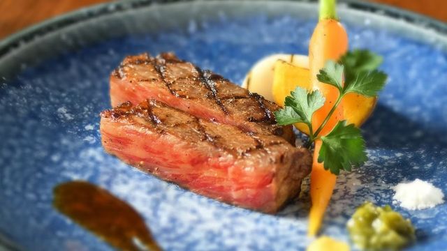 Appetizer Today's Salad New Offering: Low-Temperature Cooked Cold Roast Beef (Half Size 30g) Japanese Black Wagyu Beef Fillet Steak 150g Grilled Vegetables Rice Cooked in a Traditional Iron Pot Pickles Soup Dessert