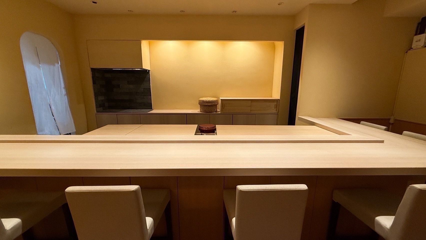 一歩足を踏み入れると広がるのは、随所に日本の美が息づく、上質な和空間。店の顔ともいえる美しい木のカウンターには、ゆったり6席をご用意しております。静かで趣のある雰囲気の中で、熟練した料理人の技を間近で眺めながら、大切な方と思い思いのひとときをお過ごしください。