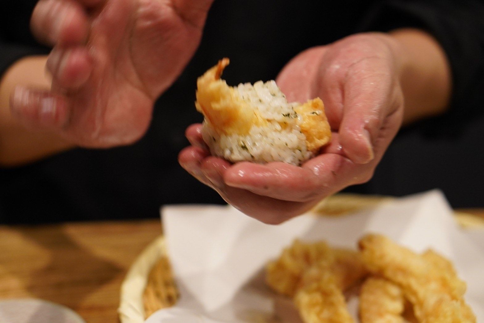 "Infinite Tenmusu" features specially prepared jumbo prawns seasoned with our homemade shrimp salt. Simple yet profoundly flavorful, it has won the hearts of many customers. We carefully select our ingredients and craft each piece by hand every day. This unique blend of meticulously treated jumbo prawns and expert craftsmanship ensures that just one bite of our "Infinite Tenmusu" will let you tas