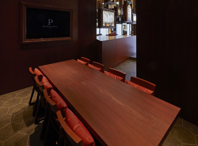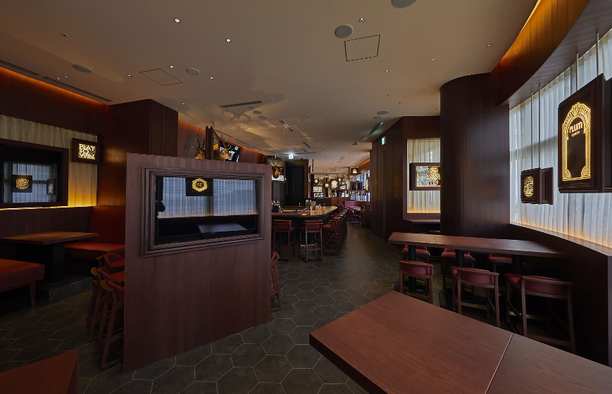 柔らかな間接照明とシアーカーテン越しのアートが店内に活気をもたらす「THE PUBLIC PLUM UMEDA」。大人が寛げるシックなバーやラウンジでありながら、スポーツイベント時には一変し、エキサイティングな空間に。店内はオーセンティックな英国PUBをイメージし、PUBLICブランドならではのウィットに富んだグラフィックアートが大阪らしいエネルギーを演出。食事は厳選した国産食材を使用したJapanese Styleのパブフードを提供し、新たなエッセンスを加えたメニューが並ぶ。