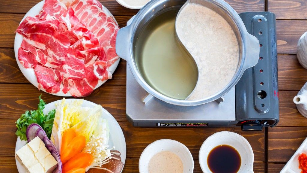 A shabu-shabu hotpot set with an assortment of Hokkaido pork and lamb, vegetables, and tofu, two types of dashi (kelp dashi, yuzu soy sauce), and two types of sauce (ponzu, sesame). Orders can be made for two or more people.