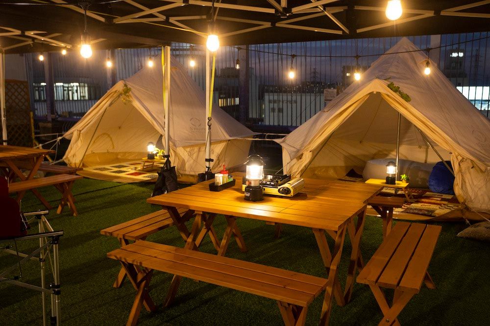 The rooftop garden has 12 glamping tents with BBQ equipment that can accommodate up to 96 people.