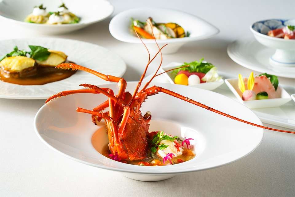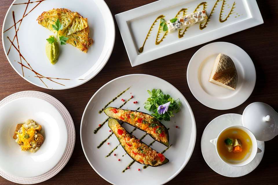 店内に一歩足を踏み入れると、広々とした開放的な空間が広がります。レストランが面するガーデンからは雄大な海がのぞめ、絶景のロケーションも当店の魅力です。そんな非日常を感じさせる店内で楽しめるのは、フレンチをベースとした和洋折衷な創作料理の数々です。食材には、当店のある伊豆産のものを贅沢に使用。今この瞬間ここでしか味わうことができない新しい食との出会いを、みなさまに提供します。