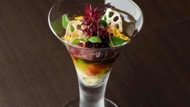国産ブドウと日本の技術で醸造された「日本ワイン」と、和食をベースにイタリアンやフレンチの要素を取り入れた革新的な料理とのペアリングをお楽しみいただけます。厳選して買い付けた日本ワインの中から、提供する料理ごとにオーナーシェフがセレクトしております。伝統ある「加賀五彩」の一つ藍色を基調とした店内は海と土をイメージしており、モダンながらも落ち着きのある空間です。