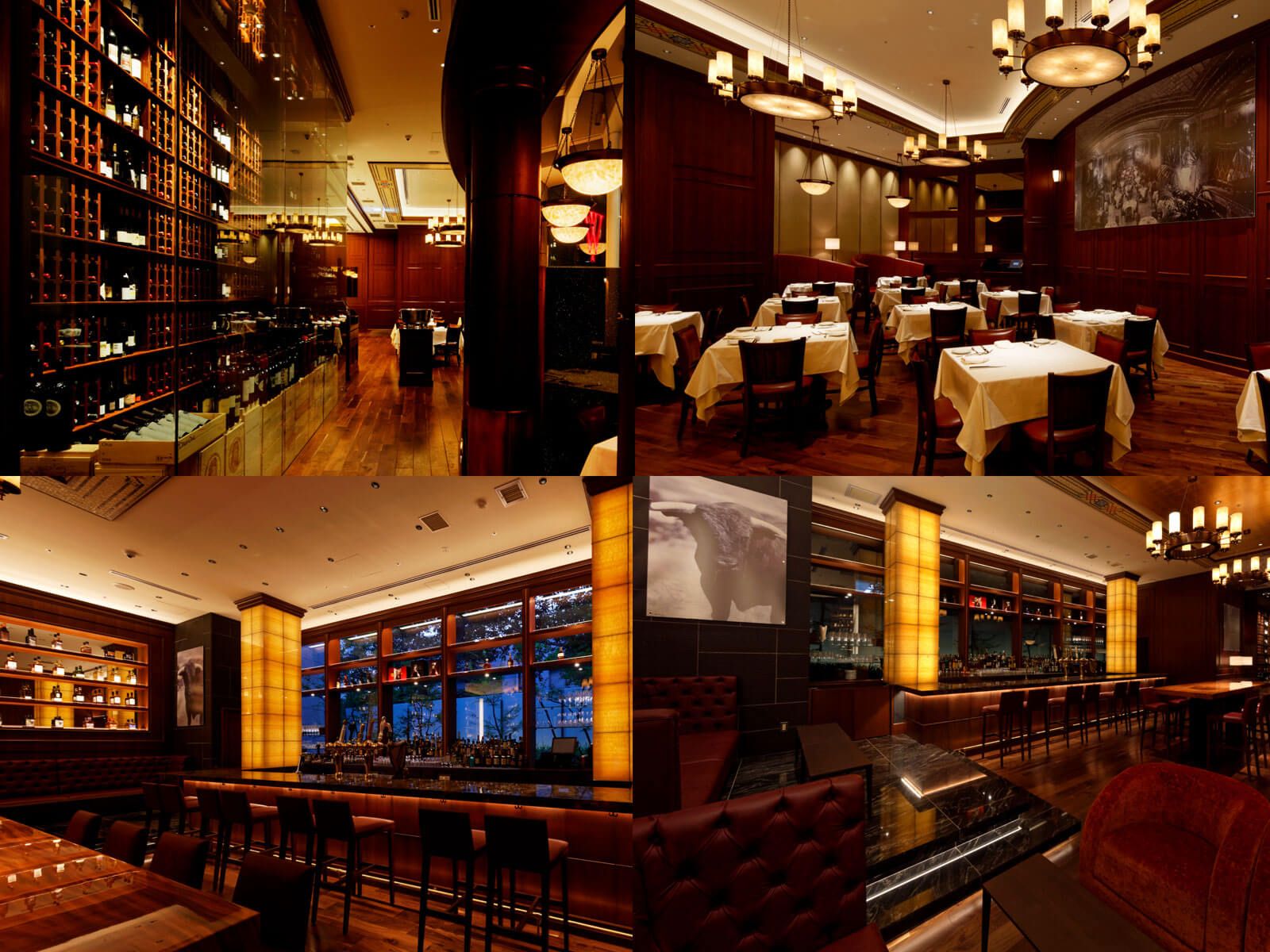 外はカリッと、中からは肉汁がジュワッとしたたる。ウルフギャング・ステーキハウスのステーキはアメリカ農務省から「最高級」と認定された牛肉「プライムグレード」を約28日間に渡り長期熟成させた肉を使い、900℃のオーブンで一気に焼き上げられます。シグニチャーではウルフギャング初となる「熊本あか牛」を使用した和牛ステーキも提供しています。白いテーブルクロスと革張りのソファが並べられた格調高い雰囲気の店内は、世界各国から選び抜かれたワインに囲まれ、最高級ステーキを味わうのに最適な空間です。